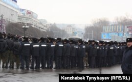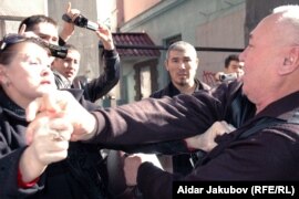 милициясының қызметкері мен шеруге шығып ұсталғандардың бірі. Алматы,